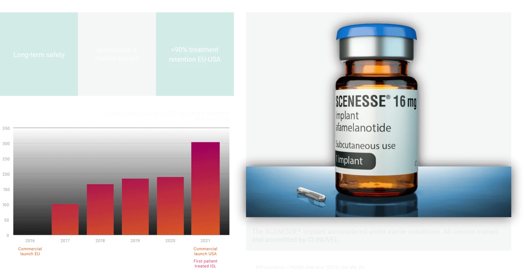 Erythropoietic protoporphyria (EPP) SCENESSE® (afamelanotide 16mg) – world’s first systemic photoprotective The progress in commercially distributing SCENESSE® (afamelanotide 16mg) continues as we have entered the seventh year of supply in Europe, and the second full year in the United States.