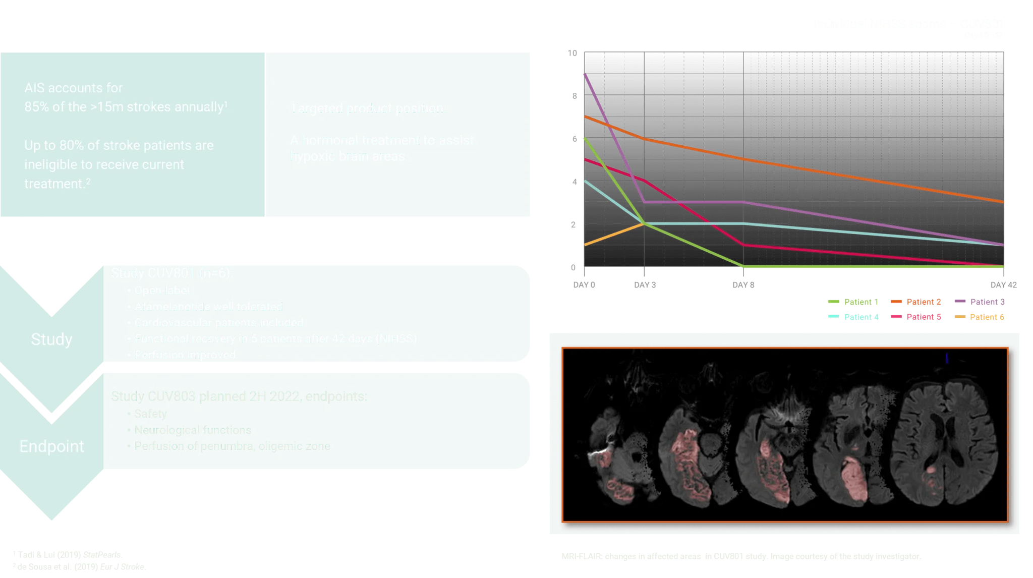 The stroke program will continue with CUV803, where the intention is to dose at higher drug levels and at different intervals, enabling us to compare these clinical findings and neuroimaging with those obtained from the CUV801 study. Here, again we work with academic experts in neurology and neuro imaging.
