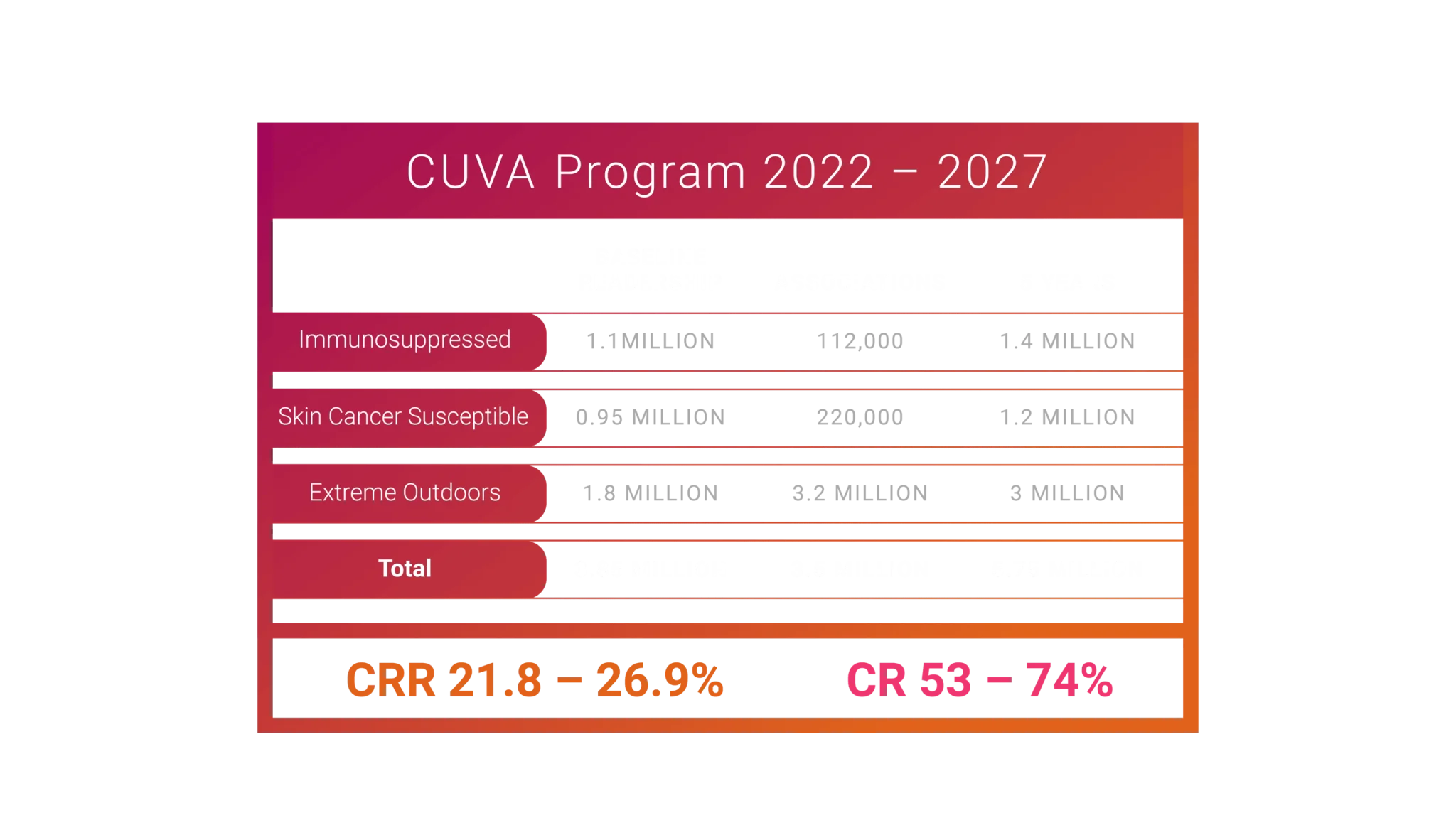 Based on available data from secondary market research, prevalence data and medical procedures, the estimated market consisting of populations at Highest Risk of solar damage and skin cancer(s) lies between 15 and 35 million.