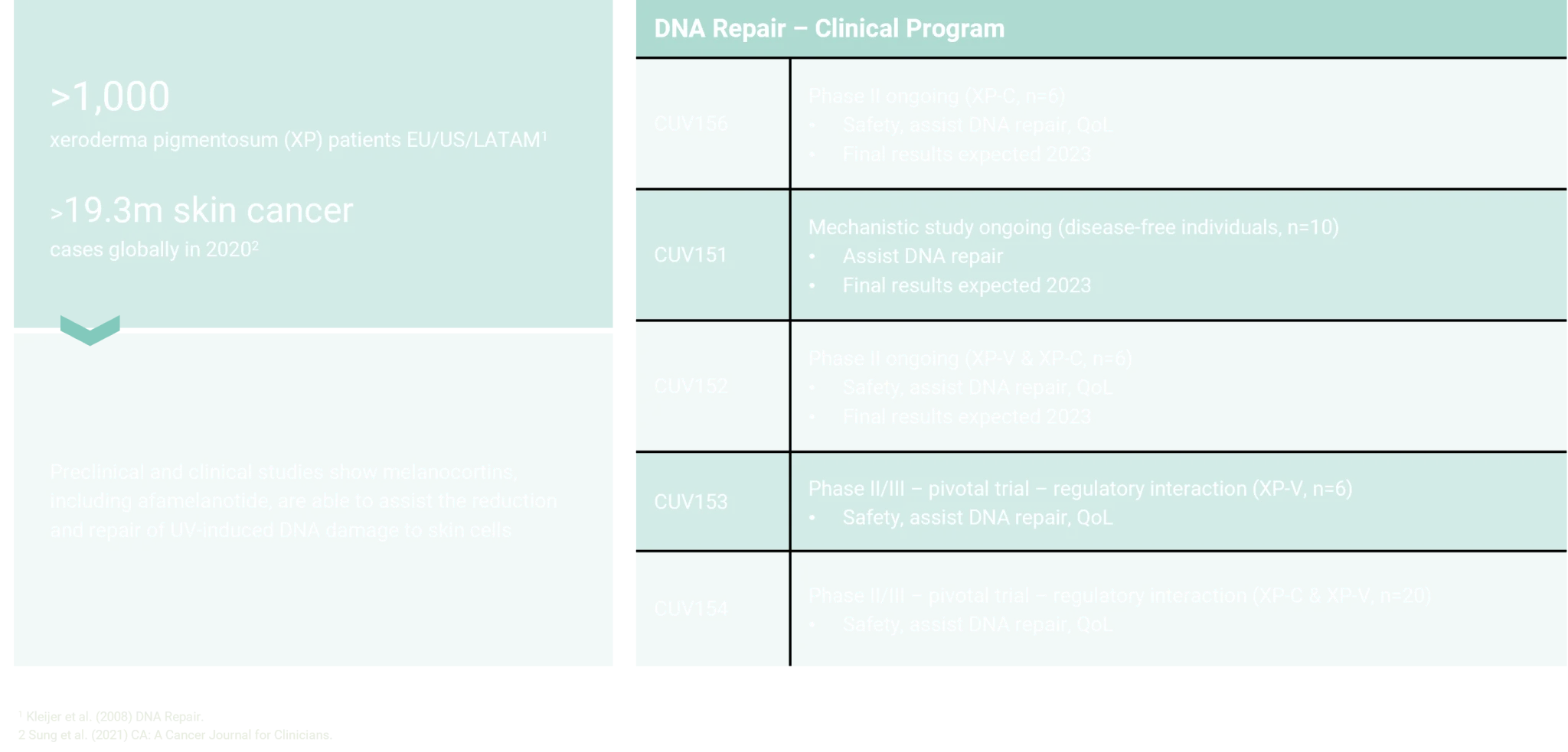 The addressable market for systemic photoprotection in XP is difficult to assess, since many countries do not yet have a patients’ registry. However, we are aware of ~1,000 patients worldwide who are affected by this most severe condition. XP-C and XP-V patients have a limited life expectancy in most countries as they succumb to multiple skin cancers.