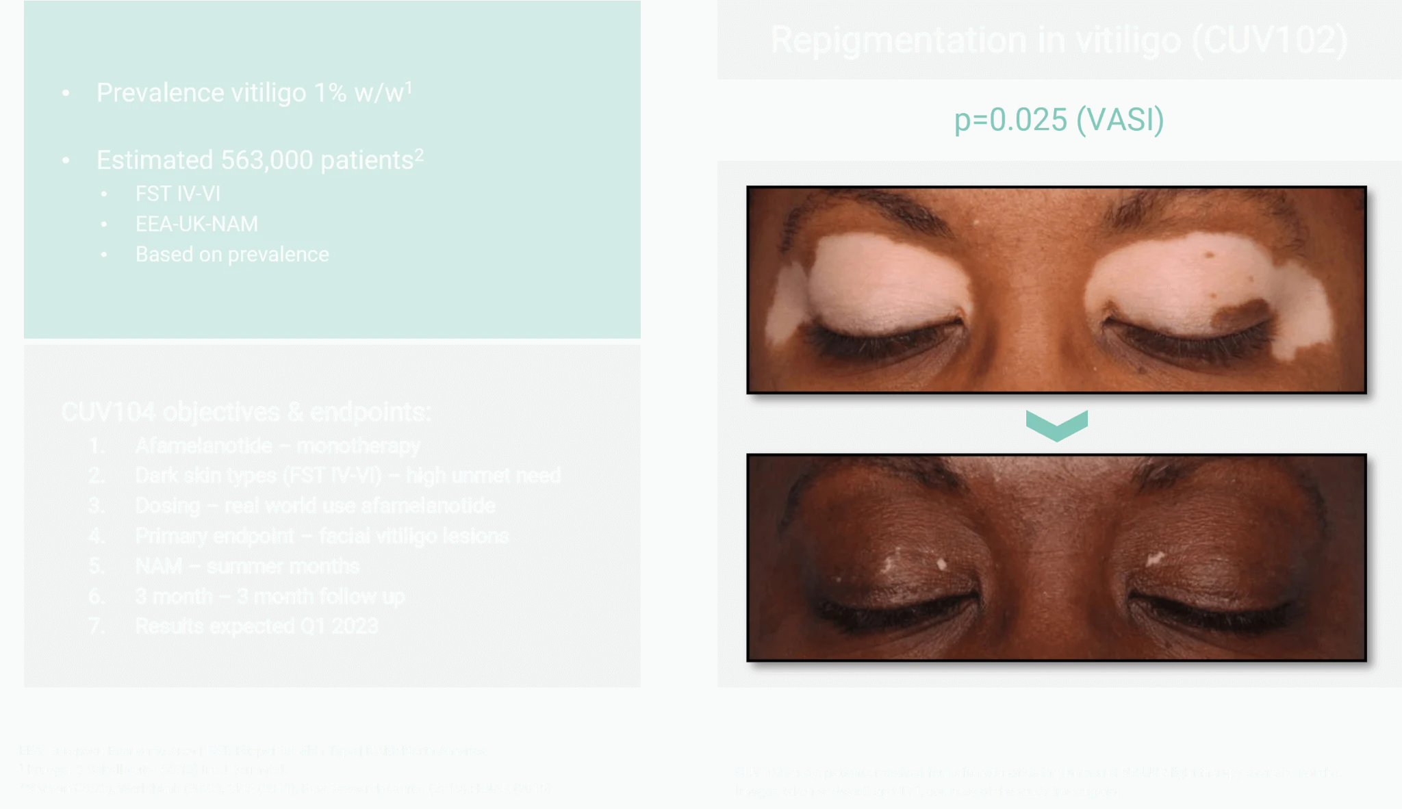 From CUV102, we learned that mean scores from validated vitiligo tools VASI and VETF decreased significantly from baseline, whereby the mean and median decrease was higher for the afamelanotide/NB-UVB group (p = 0.025; VASI, p = 0.023; VETF extent).