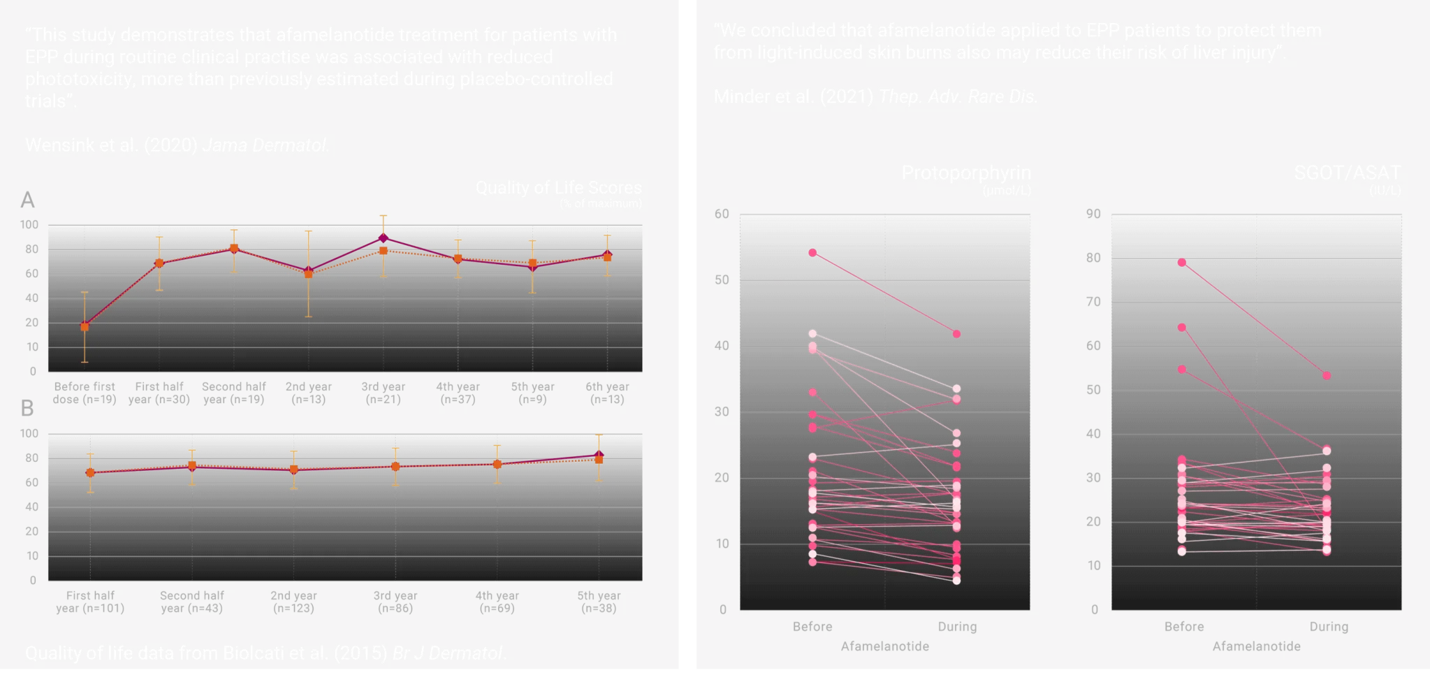 Erythropoietic protoporphyria (EPP) II SCENESSE® (afamelanotide 16mg) – world’s first systemic photoprotective Data on the use of SCENESSE® in EPP continue to be generated under real world conditions. Longitudinal analyses in Europe show a consistent improvement in quality of life reported by EPP patients under expert care (Biolcati et al., 2015) and overall reduction in phototoxic episodes (Wensink et al., 2020).