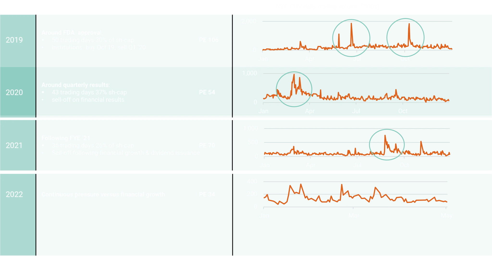 The discussion is started by looking more closely at the calendar year 2019. In this year, we witnessed an increase of trading volume in CUV starting in April to last until January 2020. Over a course of 50 trading days, 30% of the Company’s outstanding share capital was traded, whereby the price reached an all-time high of A$44.91 to retreat to the same level in January as it had been in September. This increase in volume was seen leading up to the FDA approval of SCENESSE®, which decreased after a positive outcome. The Company had not yet started distributing its lead product in the US, its receipts were increasing due to EU sales, and the balance sheet was not as strong as it is currently in May 2022.